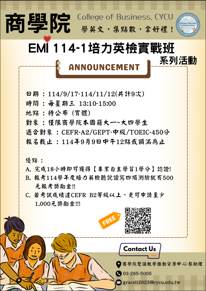 【系列一 : 培力英檢實戰班】歡迎商學院本國籍大一~大四學生踴躍參加!