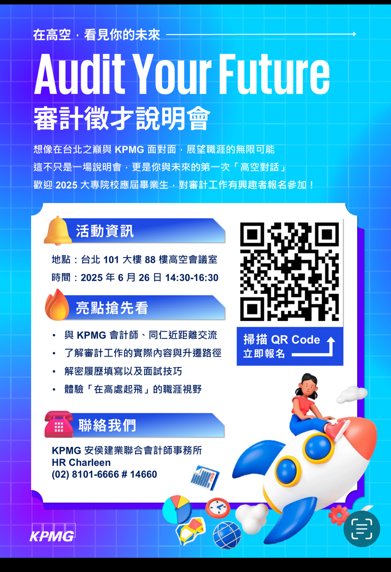(代轉)【KPMG安侯建業】Audit Your Future審計徵才說明會來囉! 2025-06-04 徵才活動與企業實習 KPMG安侯建業將於6月26日加開一場審計徵才說明會活動!歡迎有興趣的應屆畢業生同學報名參加唷 活動報名連結:https://forms.office.com/e/eqT1XiLppn 活動報名截止:6/23 You Might Also Like 財政部北區國稅局大溪稽徵所113年5月納稅服務隊實習開放報名中,報名截止日為2/28 2024-02-20 113-2【四大會計師事務所暑期實習申請&系上推薦申請時間】 2025-03-26 「安永校園春季招募|開放履歷投遞|Join us, and grow 兔gether with EY」 2023-03-22