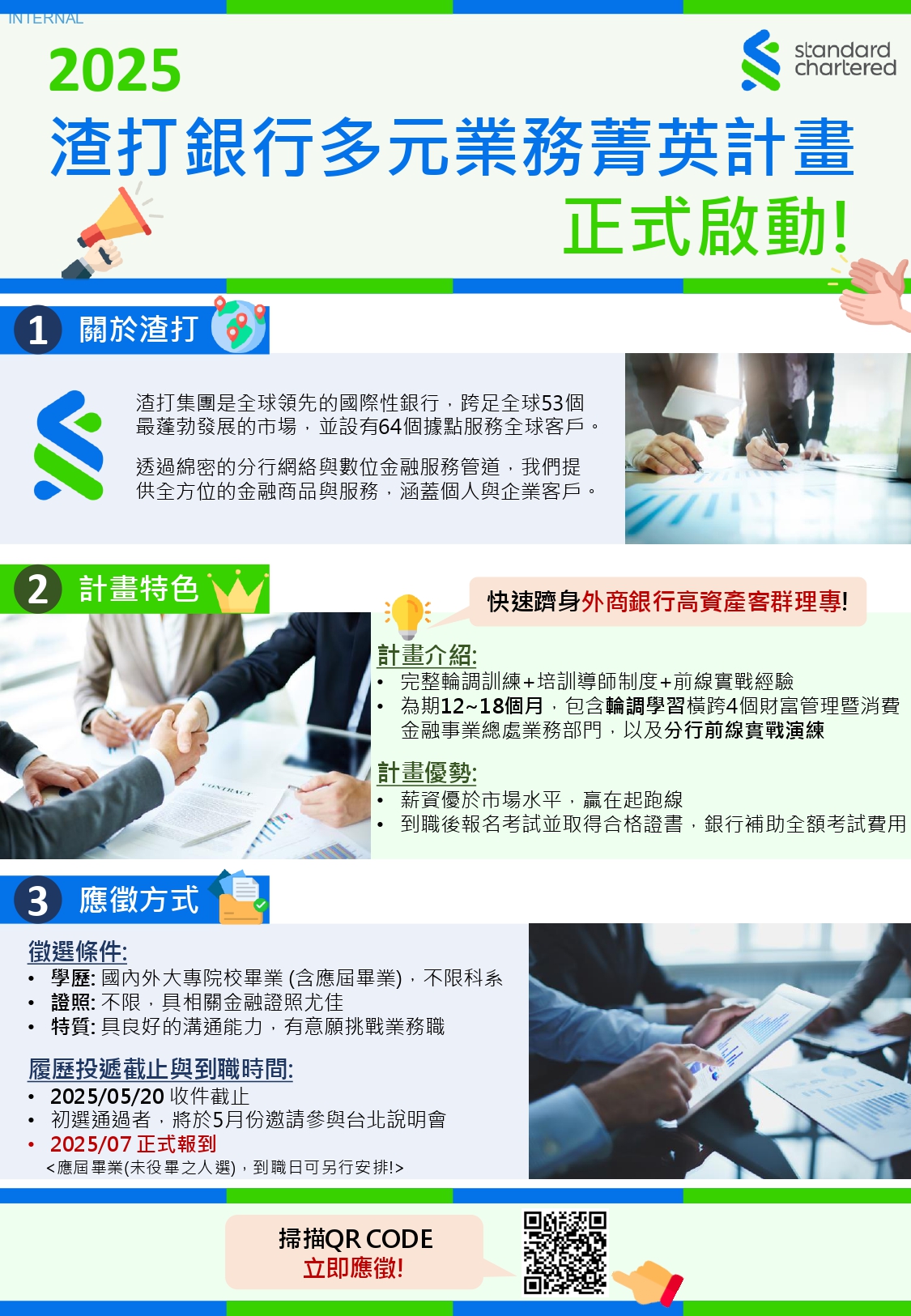 (代轉)渣打銀行2025多元業務菁英計畫 2025-04-24 最新消息 You Might Also Like 113-2【四大會計師事務所暑期實習申請&系上推薦申請時間】 2025-03-26 112-1學期輔系、雙主修申請作業 2023-04-11 112 碩士班預備研究生申請作業及說明會(大三生) 2023-03-09