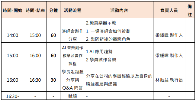 本場活動邀請到耳朵先生音樂編曲師-梁鍾暐,將 AI 音樂創作帶入課程,帶領學員們實際操作 AI 創作工具製作音樂;並解析現今音樂產業的趨勢與難題、學長姐經驗分享工作的酸甜苦辣,讓學員們重新認識與解惑臺灣音樂產業。