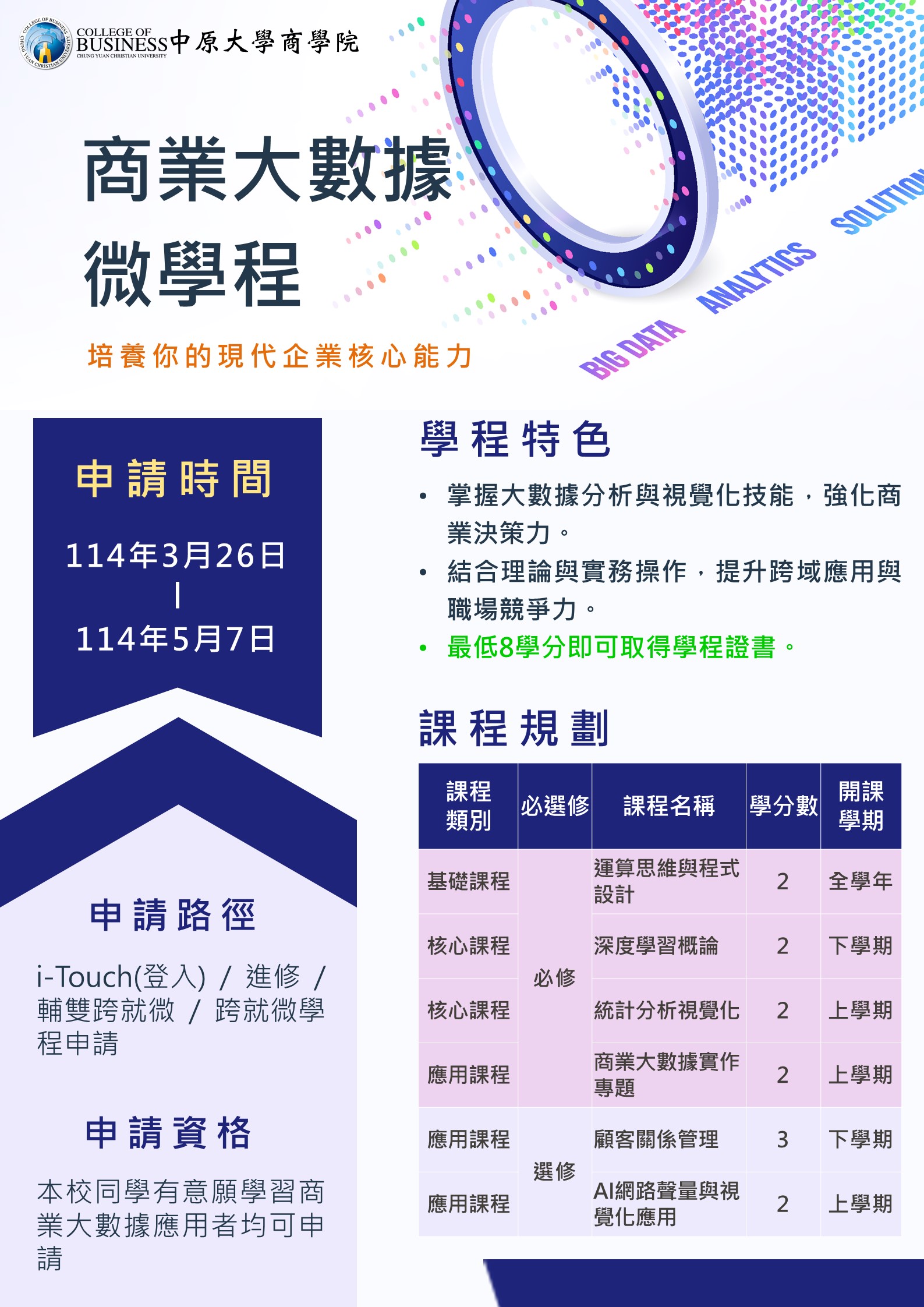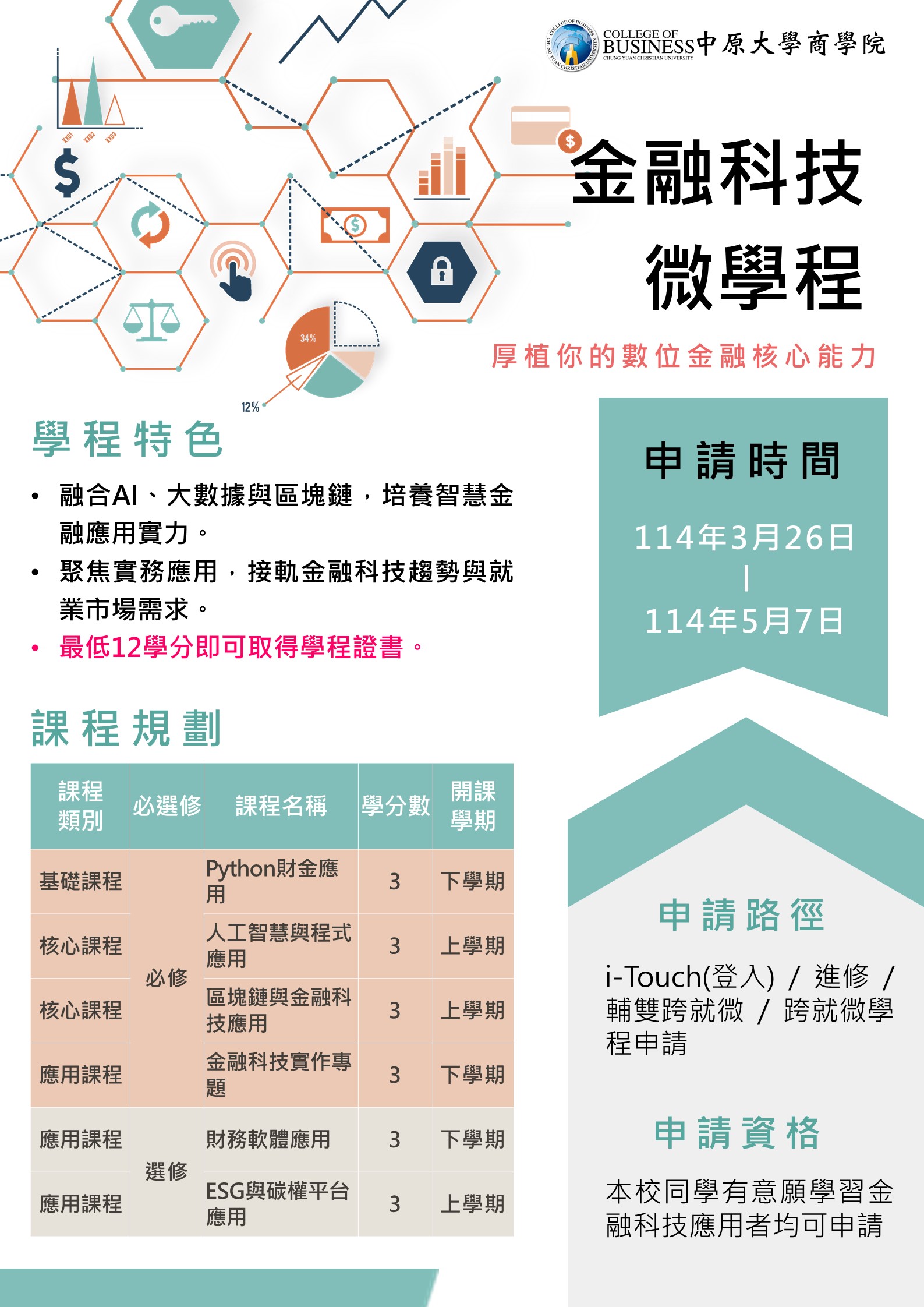 商學院「商業大數據微學程」及「金融科技微學程」招生中,歡迎同學申請修習學程 2025-04-24 最新消息 You Might Also Like 「114年度企業會計準則成果說明會-邁向淨零碳排時代對非公開發行公司財務報表的影響」線上課程與講義下載資源,歡迎使用 2025-08-25 2025 新創千里馬創業競賽,歡迎師生組隊報名參加 2025-05-08 「安永 x 中原|校園招募說明會|9/23(一)12:00-13:00」 2024-08-20