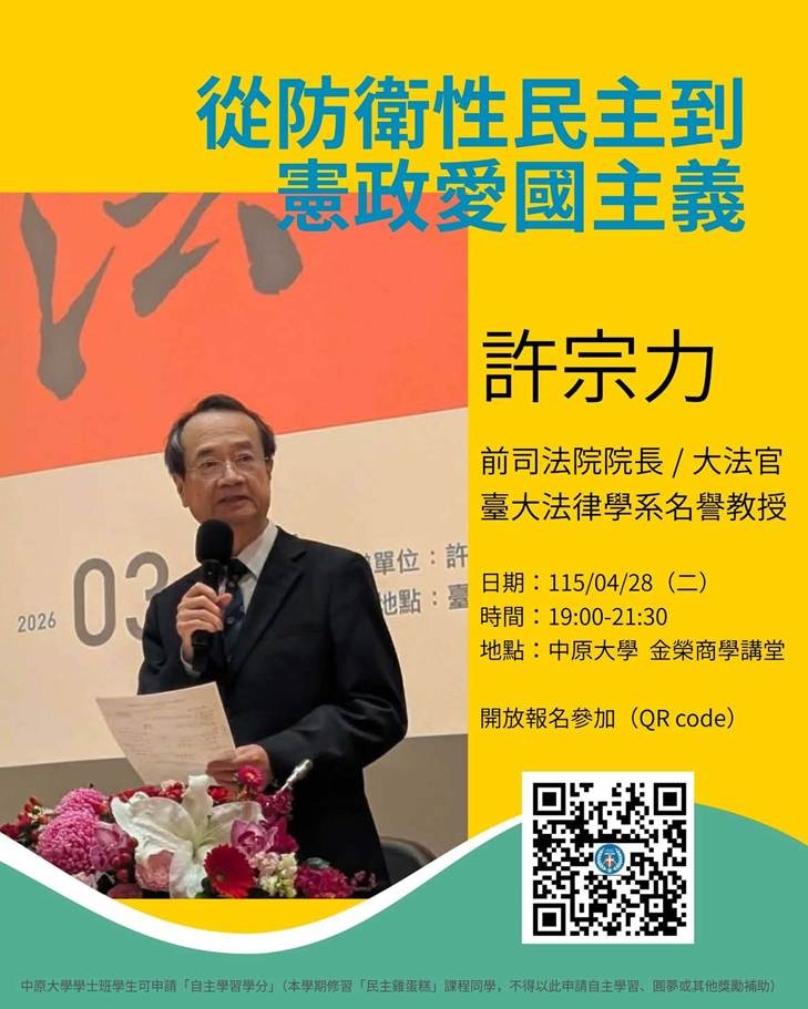 - 演講名稱:從防衛性民主到憲政愛國主義