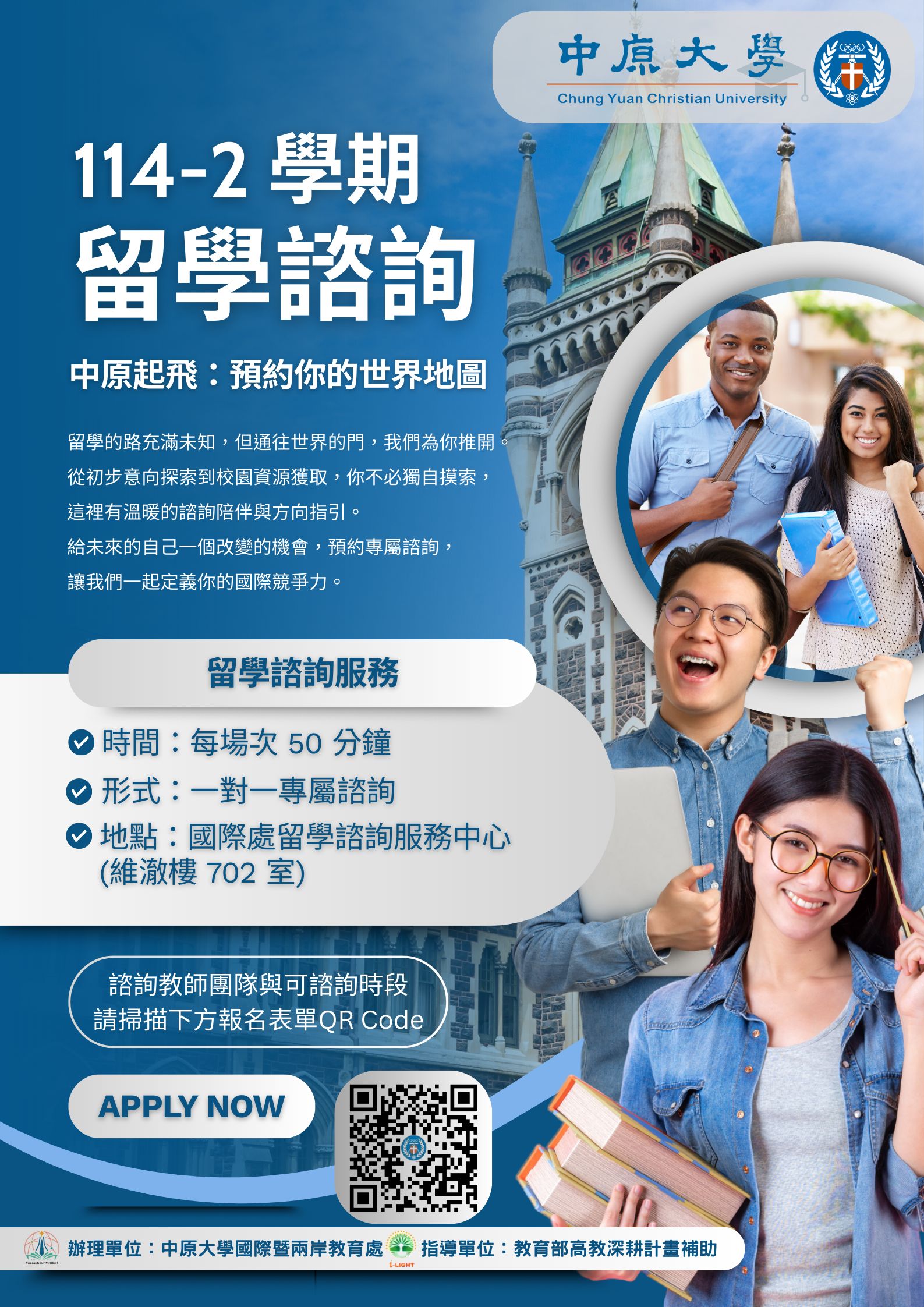 114-2學期國際處留學諮詢服務中心,免費提供給學生的留學諮詢服務開始了,詳細請見i-touch公告:https://ann.cycu.edu.tw/aa/frontend/AnnItem.jsp?sn=67938