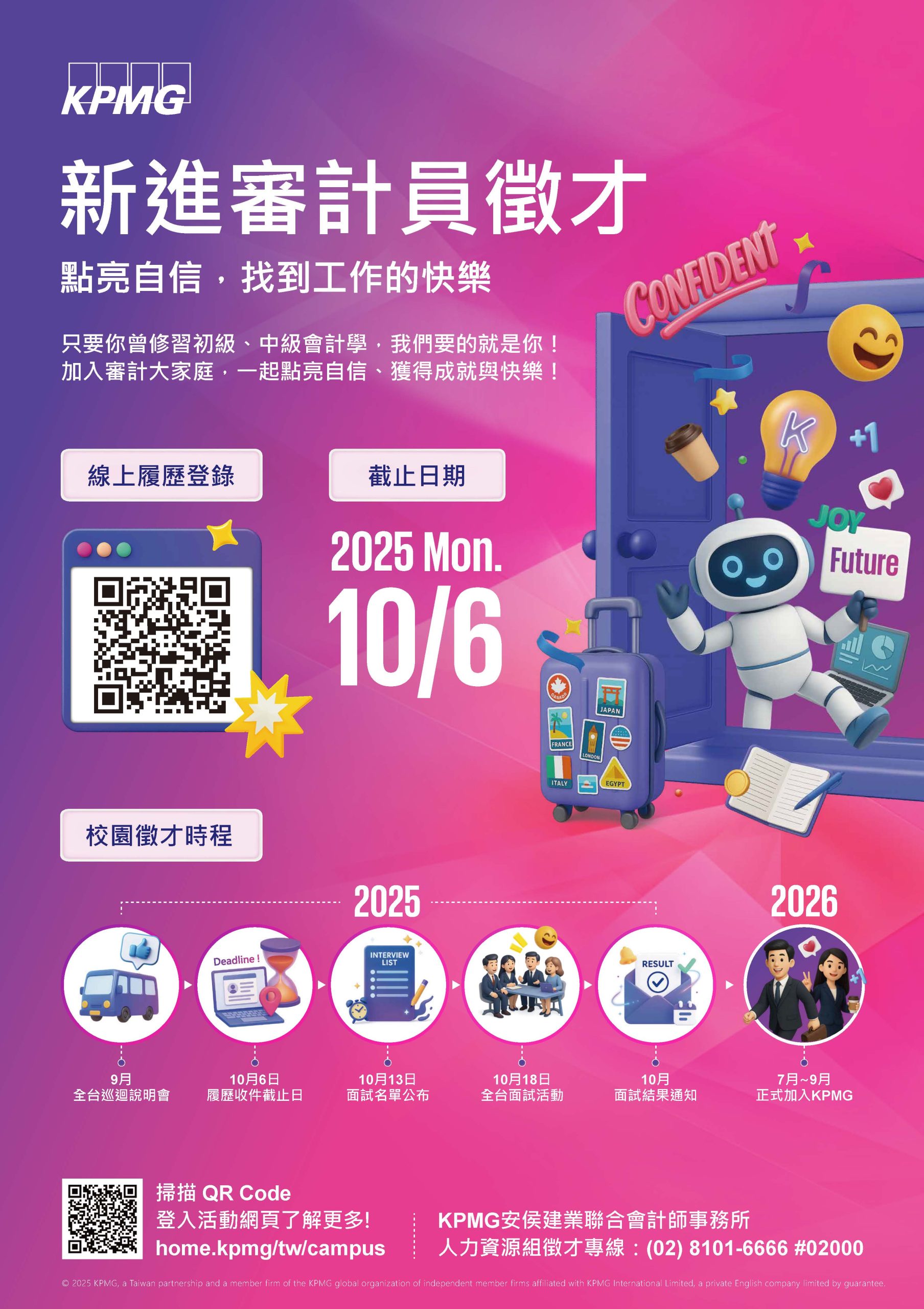 KPMG Taiwan Careers粉絲團,讓你掌握第一手的校園徵才活動資訊:https://reurl.cc/Ovx7Z9