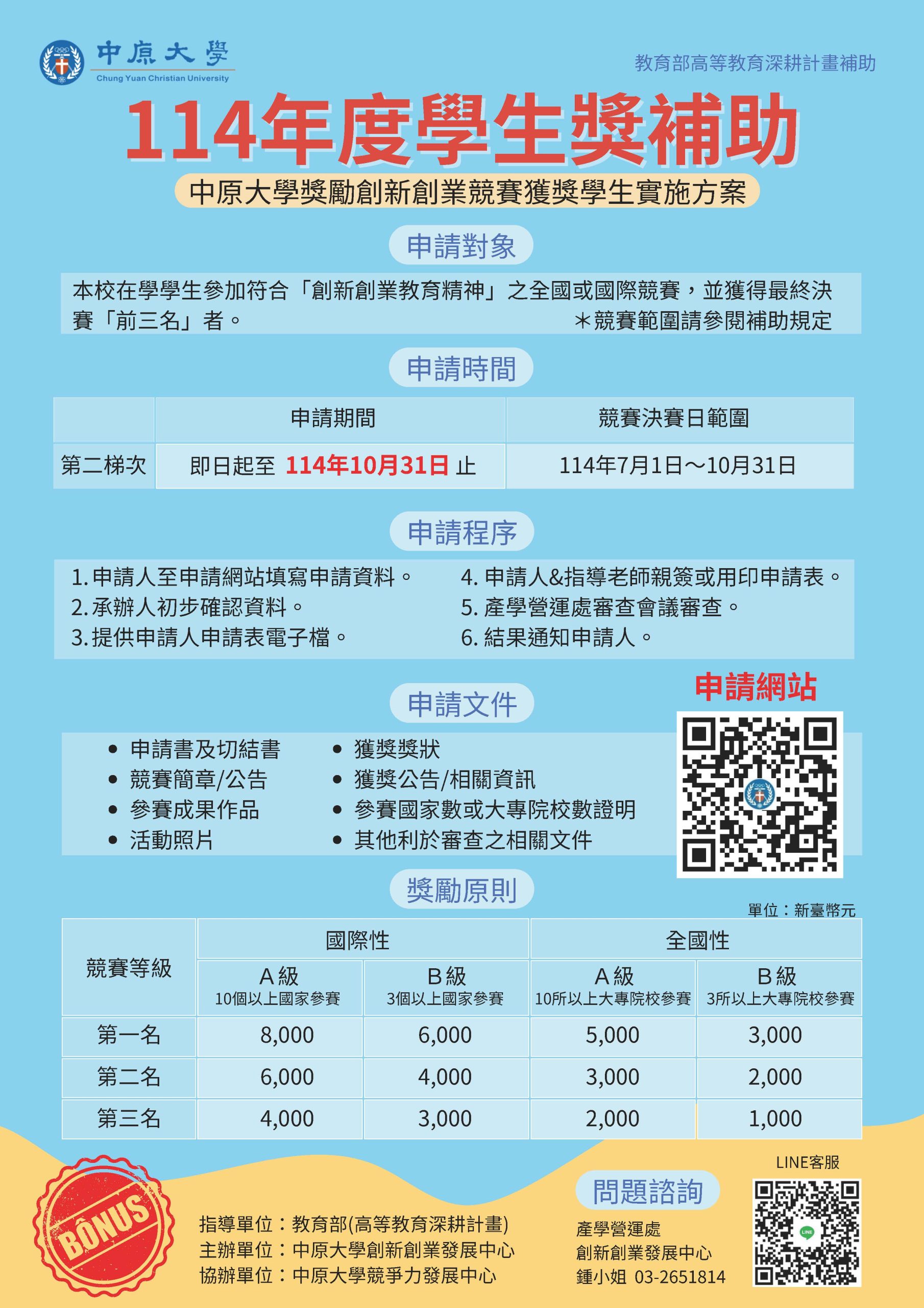 中原大學(以下簡稱本校)產學營運處(以下簡稱本處)基於創新創業教育精神,培養學生創新思維、創新能力及創業精神,鼓勵學生積極參與全國及國際性創新創業競賽,特訂定「中原大學獎勵創新創業競賽獲獎學生實施方案」(以下簡稱本方案)。