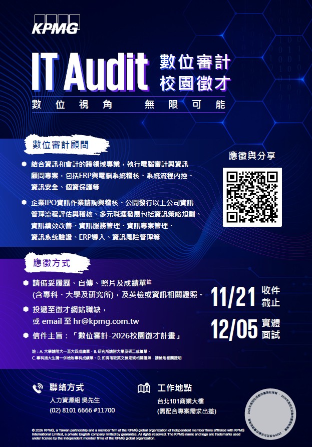 履歷投遞網址: 2026校園徵才-數位審計服務|KPMG_安侯建業聯合會計師事務所| https://www.104.com.tw/job/6wikw?jobsource=cs_sub_custlist_rc