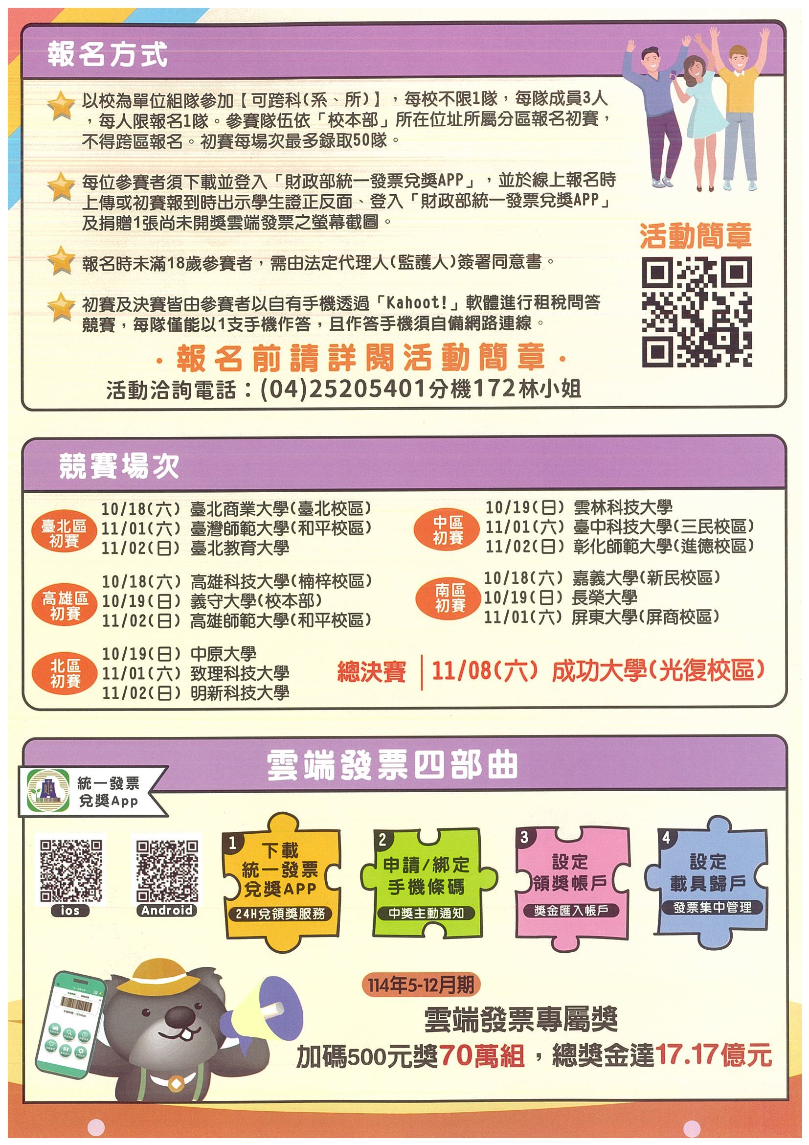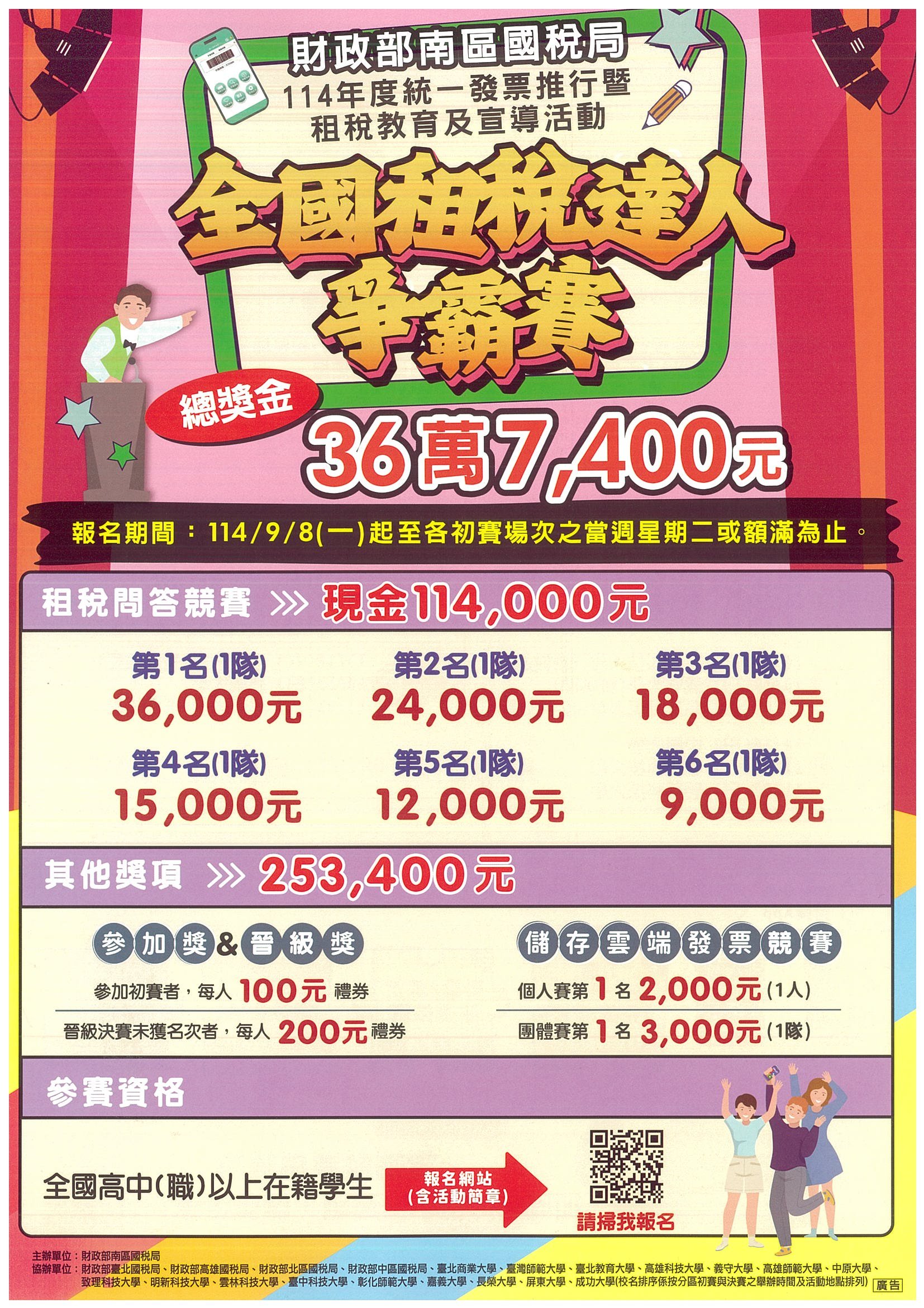 6.更多活動資訊請詳附件「114年度統一發票推行暨「全國租稅達人爭霸賽」 租稅教育及宣導活動 【活動簡章】」。