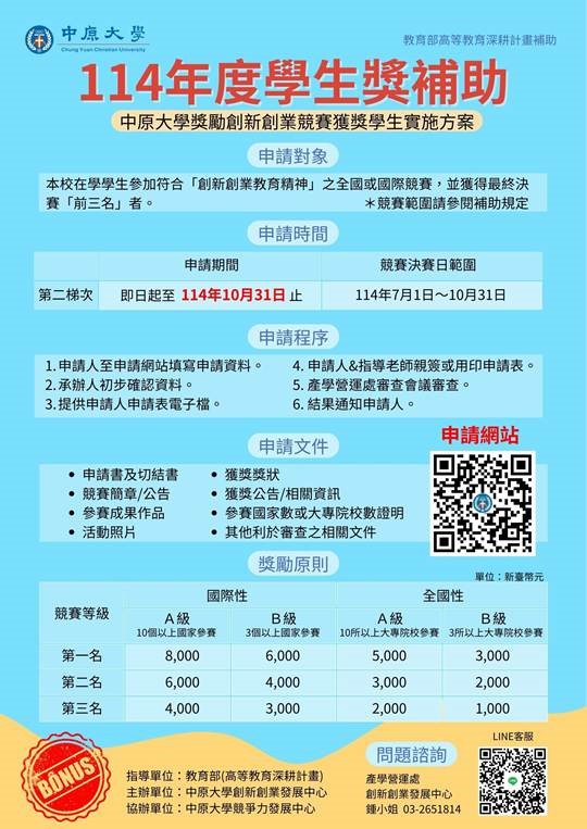 凡參加符合本校「活用創意」、「激發創新」、「迎向創業」等教育精神之競賽,並於最終決賽榮獲前三名者,均得依《中原大學獎勵創新創業競賽獲獎學生實施方案》提出獎勵補助申請。