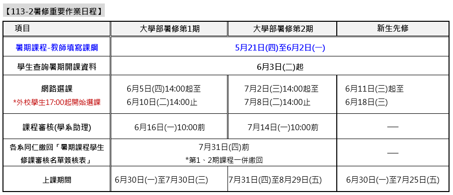 113-2學期暑期課程相關重要日程 2025-05-22 最新消息 113-2學期暑期課程開課資料已公告,請同學自行參閱暑期選課系統,謝謝。 https://itouch.cycu.edu.tw/active_project/cycu2000h_03/cycu_03/main.jsp You Might Also Like 美國YMCA of the Rockies 2025 暑假打工旅行計畫開始受理申請 2024-09-16 114年普仁崗文藝獎開始徵件囉!獎金好禮等你拿! 2025-02-18 114/09/03走進會計未來:你的大學四年,決定你的職涯競爭力」分享講座 2025-08-12