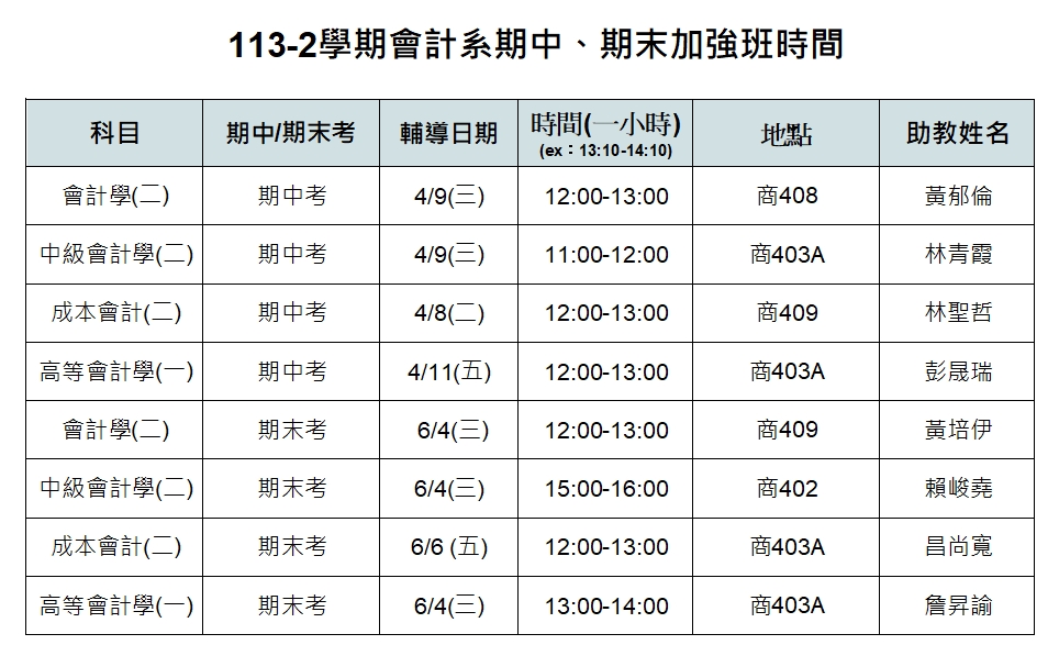 113-2 期中及期末加強班輔導時間安排 2025-03-19 最新消息 各位同學好 期中及期末加強班輔導排時間安排如下,請同學多加利用至排班教室進行諮詢。 You Might Also Like 114學年度【自選學術導師】,學生申請時間至5月25日,歡迎同學上網申請 2025-05-08 113學年度商學院畢業生問卷,請畢業生填寫 2025-06-06 (代轉)「2026年第五屆大專校院會計盃」辯論比賽 2025-11-05