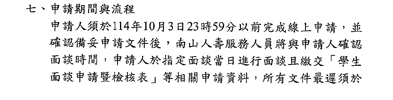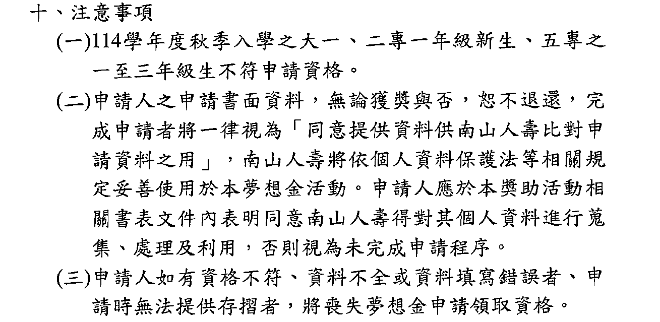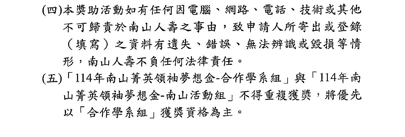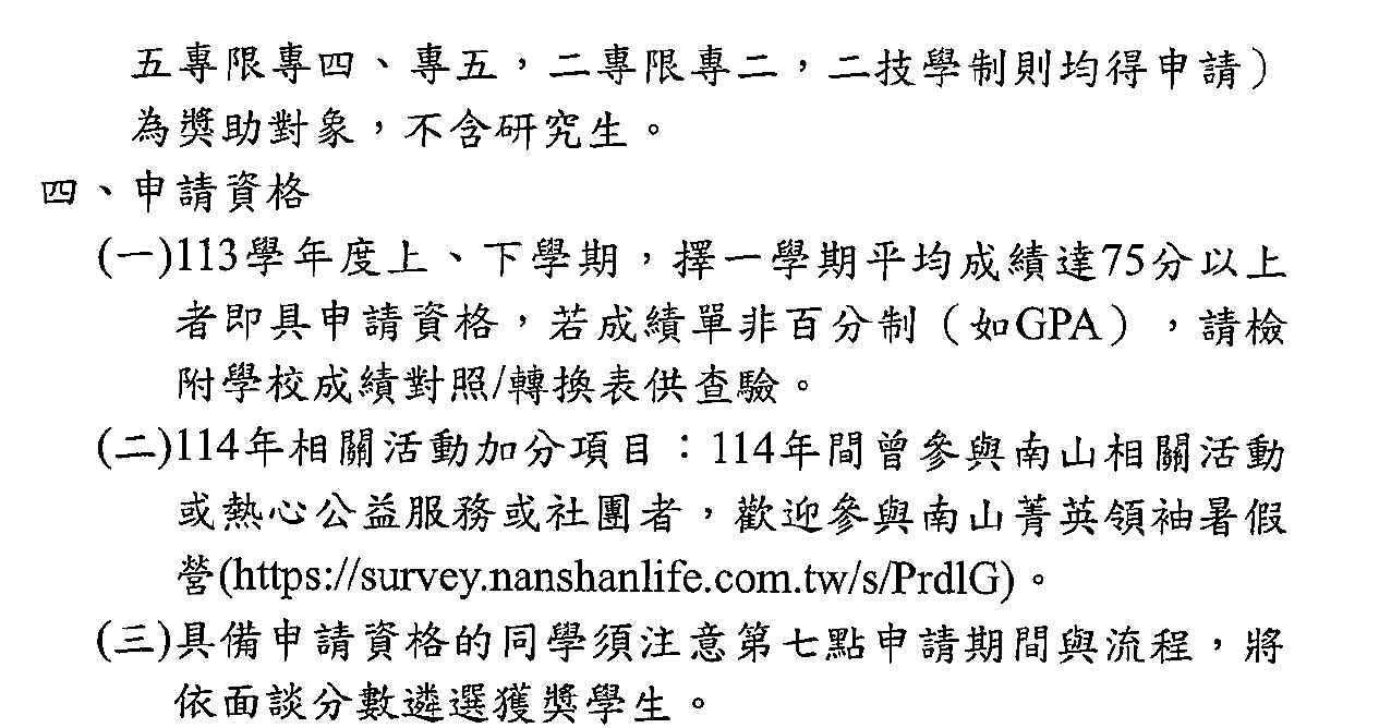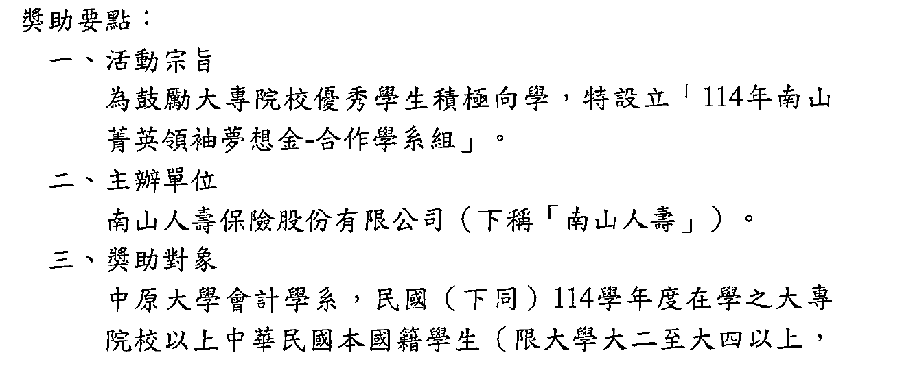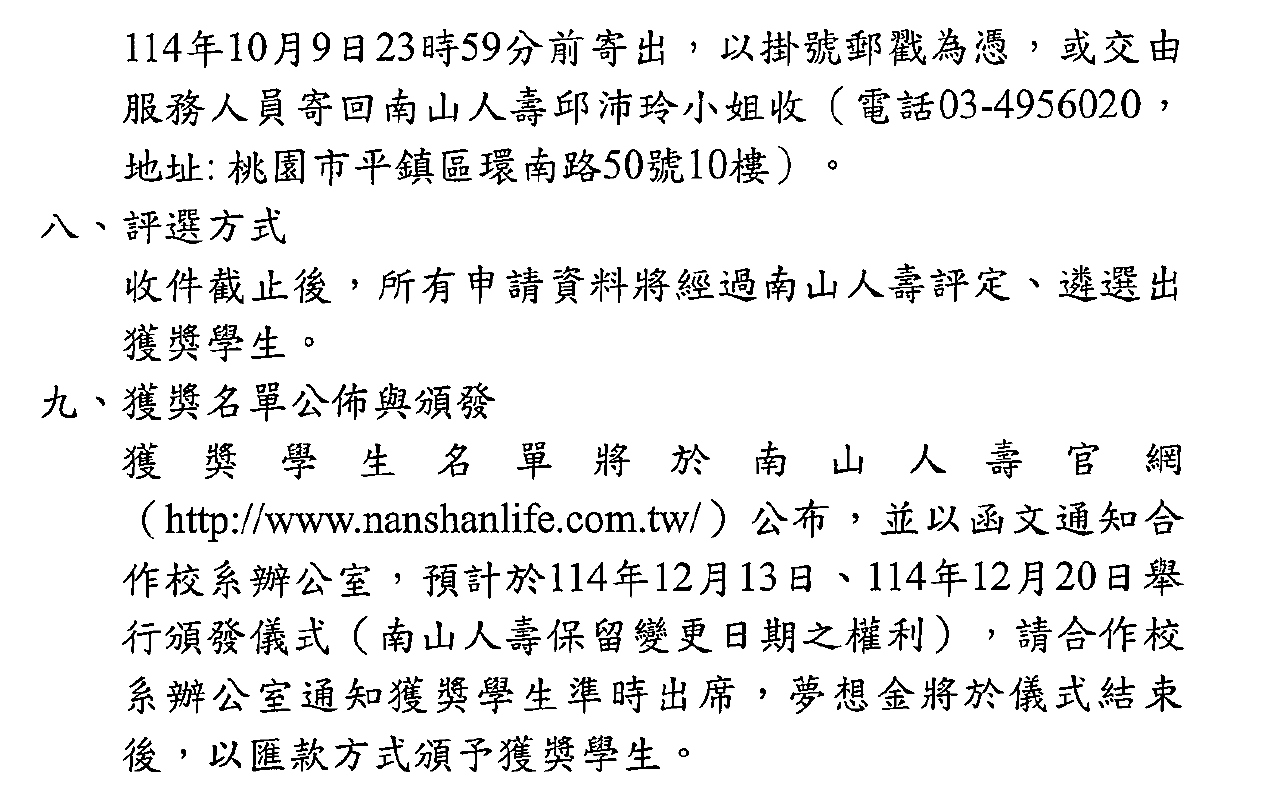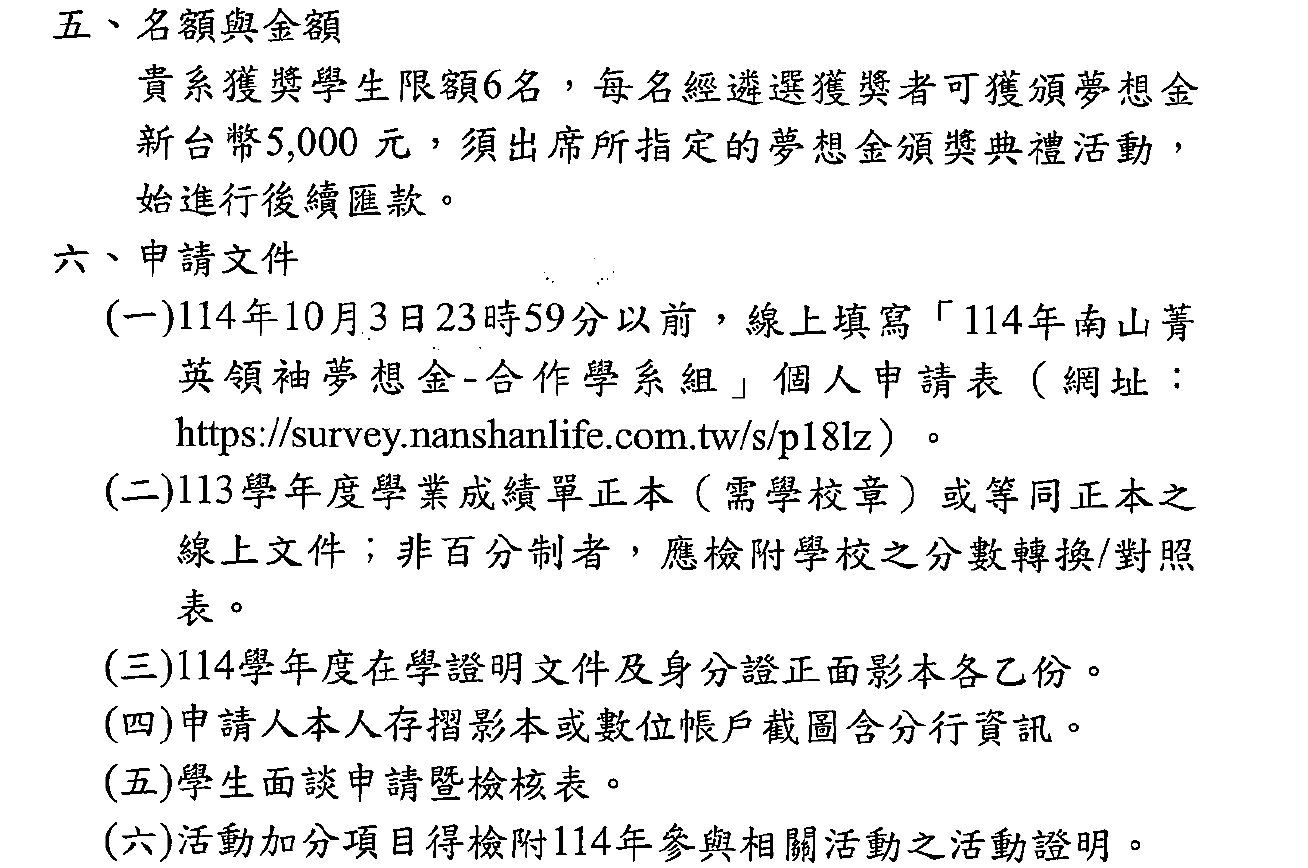 114年南山菁英領袖夢想金,歡迎同學申請 2025-08-25 獎學金公告 114年南山菁英領袖夢想金_面談申請暨檢核表下載 114年南山菁英領袖夢想金_申請連結下載 114年南山菁英領袖夢想金_公文辦法下載 You Might Also Like 114年立達基金會圓夢計畫獎學金 2025-09-12 中原大學商學院雙語計畫學生英語能力檢定補助暨獎勵要點 2024-01-23 113-2 財團法人福琳工商發展基金會工商學生清寒獎學金 2025-02-17