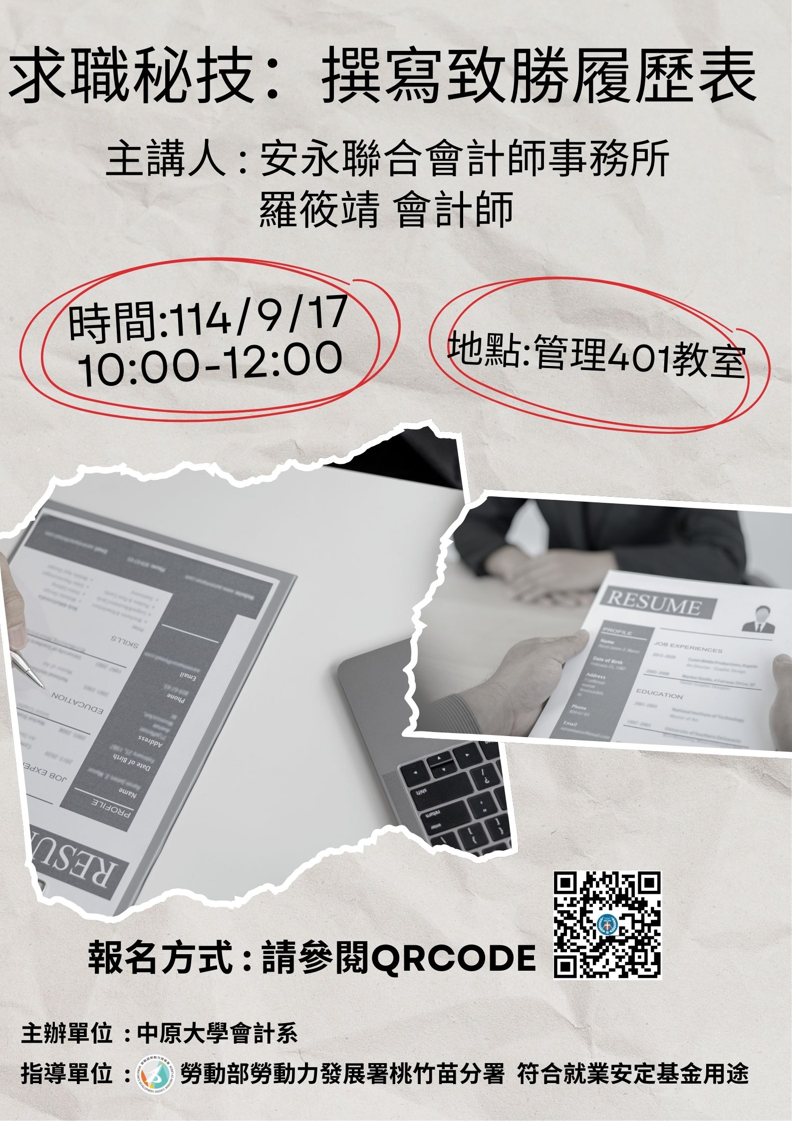 你是否正準備踏入職場,卻對如何撰寫一份專業又吸睛的履歷表感到困惑?會計系同學們千萬別錯過本次職涯講座!本場講座將由具備豐富業界經驗的專業講師親自授課,帶領大家深入了解求職過程中最關鍵的第一步——履歷撰寫技巧。