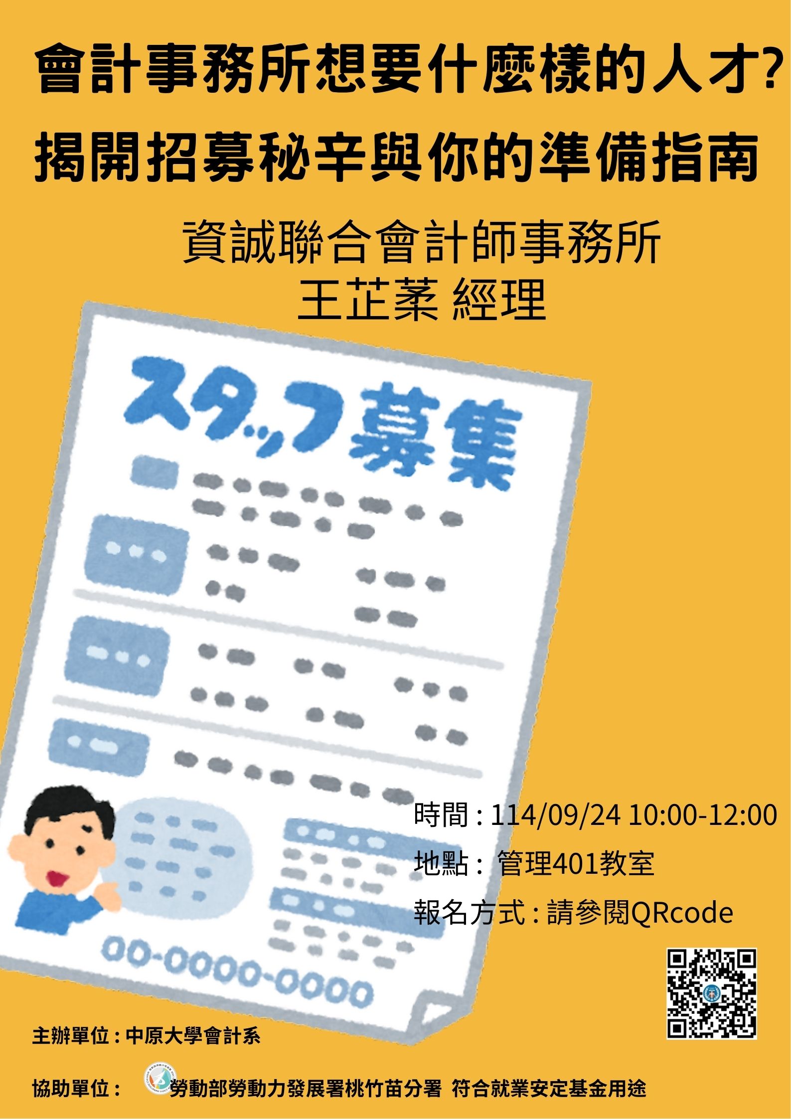 進入會計師事務所或各行各業會計相關部門,是許多會計系學生的職涯起點。但你知道,除了學業成績與證照外,會計師事務所真正看重的是什麼嗎?這場講座將揭開會計師事務所招募的條件,幫助你釐清準備方向,提升被錄取的機會!