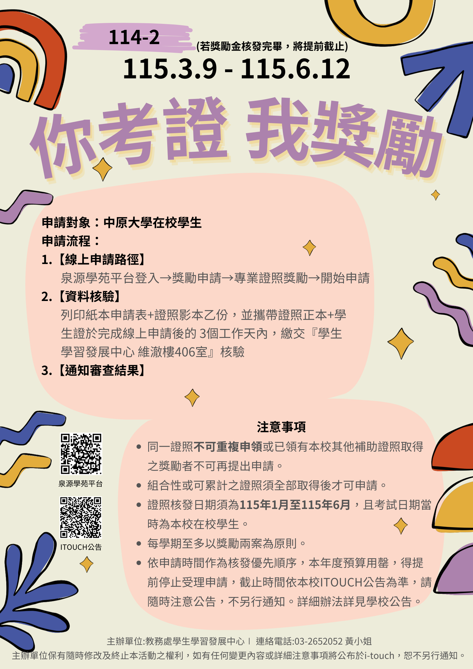 114-2中原大學學生考取【專業證照獎勵】已開始申請! 2026-03-19 最新消息 114-2中原大學學生考取【專業證照獎勵】已開始申請! 申請日期 : 115年3月9日至115年6月12日止 證照核發日期: 115年1月至115年6月 繳交地點 : 教務處學生學習發展中心 維澈樓406室(中午12:00-13:30不收件) You Might Also Like 【利興會計師事務所】2024年實習生招募 2024-05-13 113-1 企業實習(二)課程學分申請提醒 2024-11-15 【活動宣傳】《手繪中原》徵件開跑【藝術中心】 2025-07-17