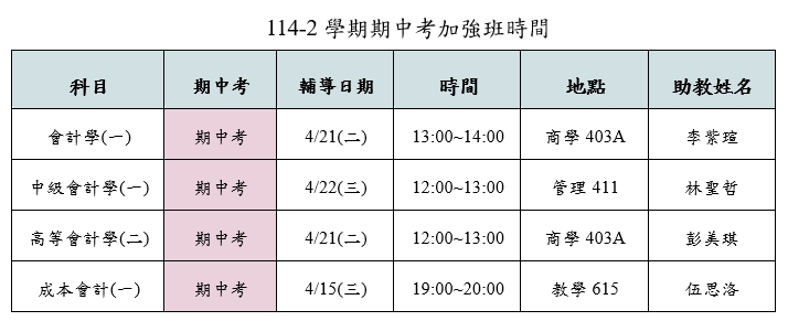 114-2 學期期中考加強班時間 2026-04-14 最新消息 You Might Also Like 113-1「雙輔雙金」獎勵申請至11/15截止,歡迎同學踴躍申請 2024-10-15 【114-2 會計系線上表單及企業實習加選作業已完成】 2026-01-21 113-2【畢業班期末教學評量】於114/4/28~5/18 進行施測 2025-04-22