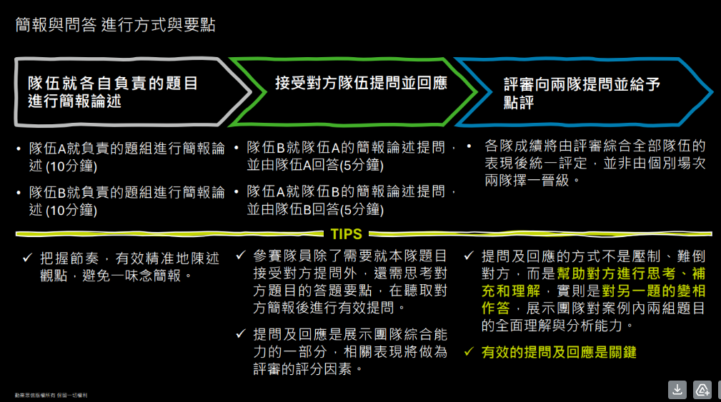 多數學校關心的賽制變動,籌備小組整理了本屆賽事「簡報與問答環節」的進行方式與要點,請參閱下方資料及附件比賽手冊,以利師生掌握比賽準備方向。
