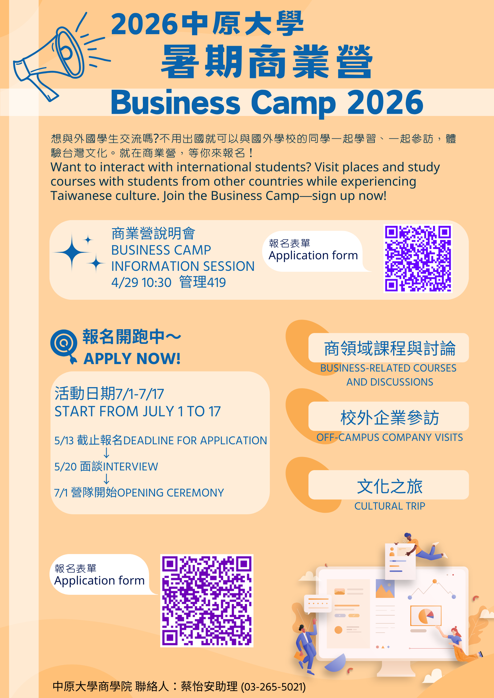 2026中原大學暑期商業營Business Camp 2026 2026-04-17 最新消息 You Might Also Like 【重要!! 114-2 會計系線上表單選課注意事項與線上表單加退選公告】 2025-12-05 中壢客運「【181A】中原大學–高鐵桃園站」公車暑假期間暫停營運公告 2025-06-20 114/09/10「模擬面試,致勝面試技巧大揭密」分享講座 2025-08-31